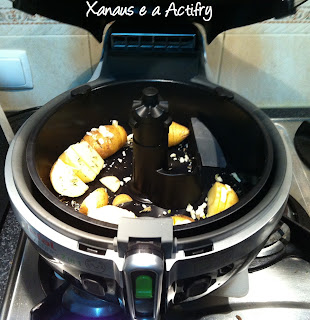Em seguida deixei o tabuleiro do peixe de fora e só com a cuba fechei a actifry e programei 35 minutos e em seguida carreguei no botão 2 em 1 e seleccionei o peixe (8 minutos que vem programado).