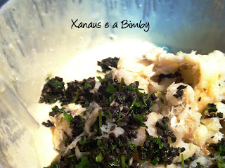 Em seguida, sem lavar o copo, coloquei os ovos, a farinha, a água, o leite o sal (aqui tem que ser ter em atenção ao sal do bacalhau) e programei 2min, vel 5.