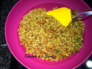 Deitei por cima do preparado e envolvi bem com a espátula. Decorei com o pão ralado.