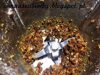 Junto às Tâmaras, a aveia reservada e os restantes 45gr por triturar, a linhaça, a canela, o sal, a manteiga, o mel e a baunilha e misturo 15 seg, vel 3.5.